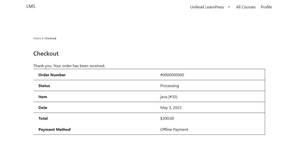 - Placed an order with unilevel product (test LearnPress MLM Courses) worth of $300